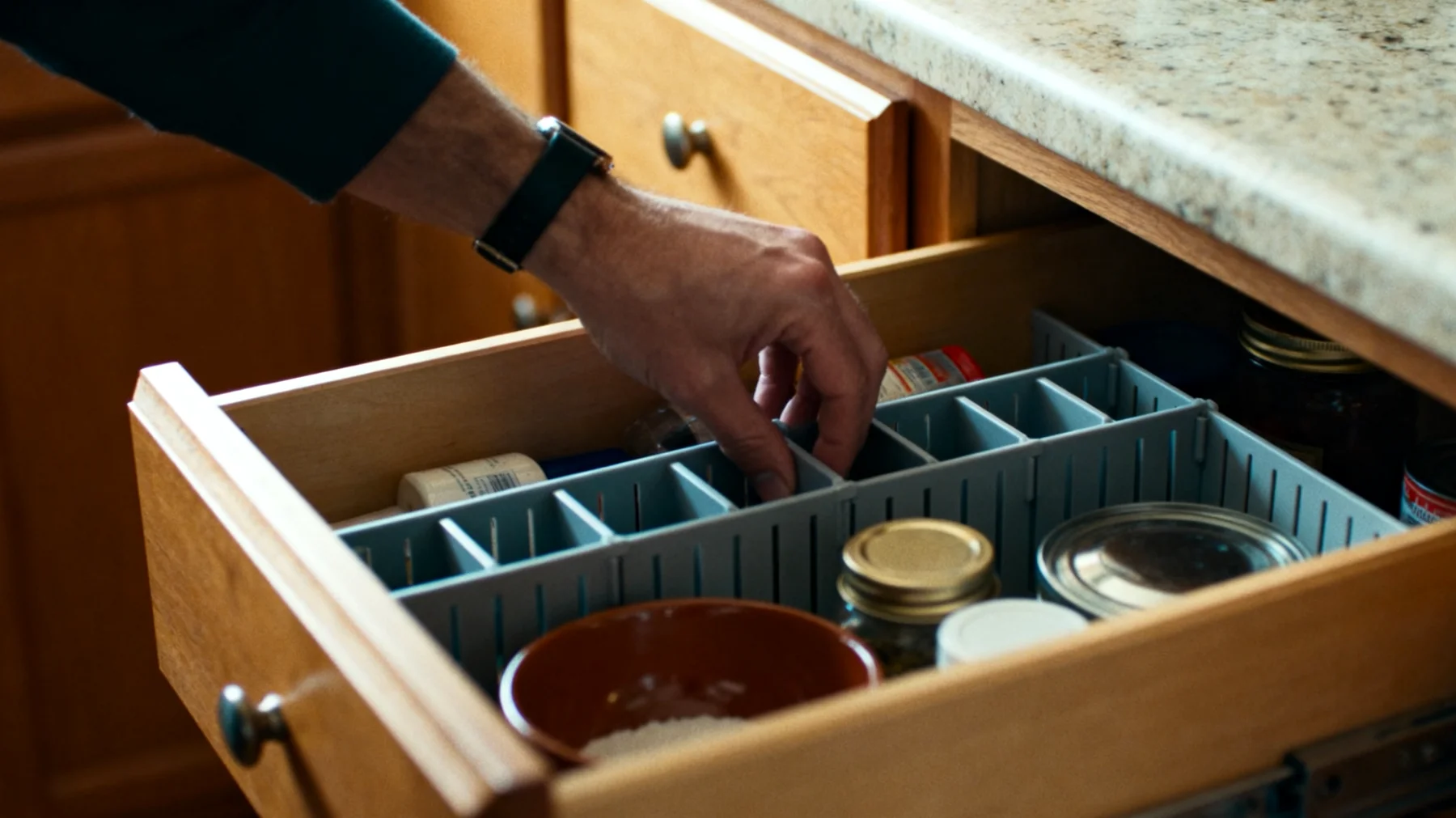 Questo cambio di prospettiva modifica l’intera logica dell’organizzazione domestica. Non si tratta più solo di trovare posto per gli oggetti, ma di posizionarli dove l’uso quotidiano li richiede davvero. Una volta che gli utensili chiave sono visibili e accessibili, l’intera disposizione inizia a ruotare attorno alla funzione e non solo allo stoccaggio. Nel cassetto liberato puoi finalmente inserire oggetti molto più compatibili con quella disposizione: coperchi, ciotole impilabili, sacchetti ermetici, vasetti da dispensa.